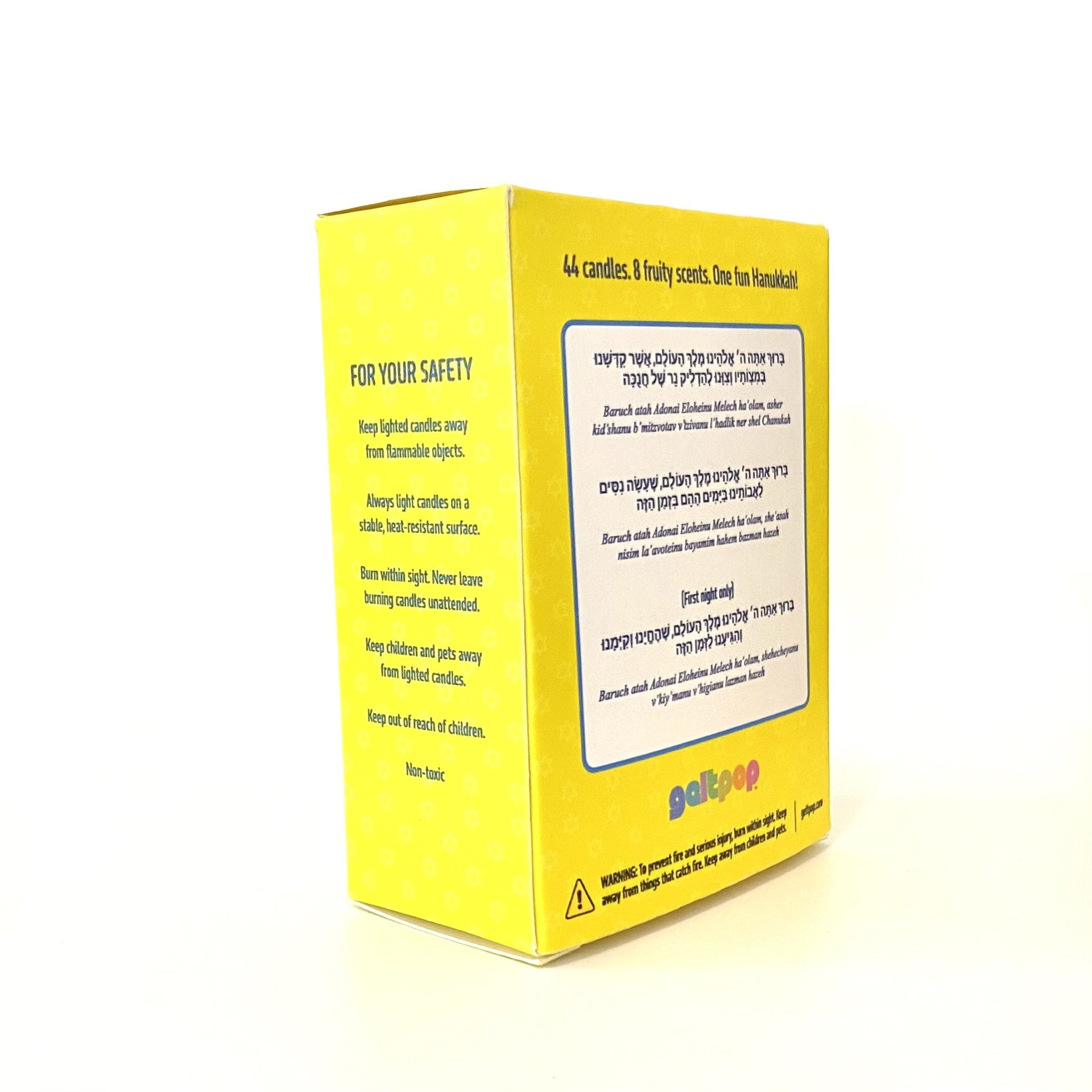 Each candle comes in a vibrant hue and one of eight fruity scents - strawberry, orange, pineapple, green apple, blueberry, grape, watermelon, or coconut - for an unexpected treat that’s sure to delight at your next Hanukkah gathering.