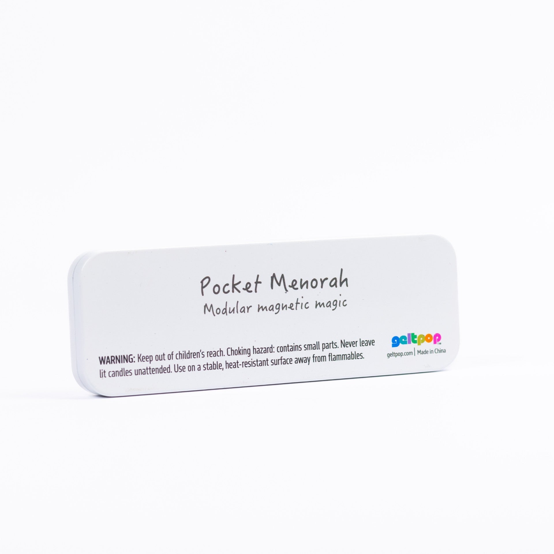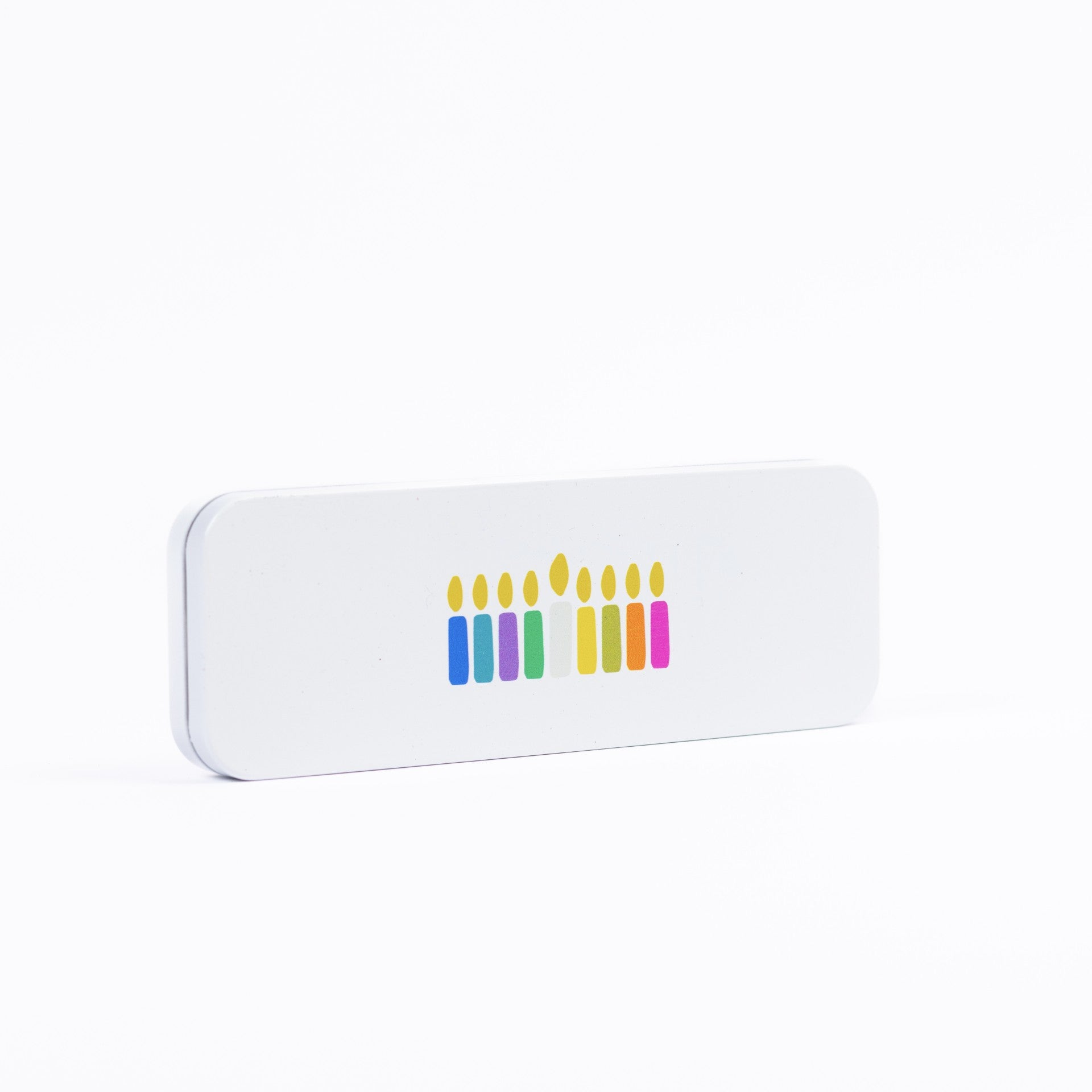 Slim, sleek, and pocket-ready, it’s perfect for travel or candle-lighting at a friend’s house. Magnetic candle holders click satisfyingly onto the tin, letting you arrange and rearrange your hanukkiah however you like.